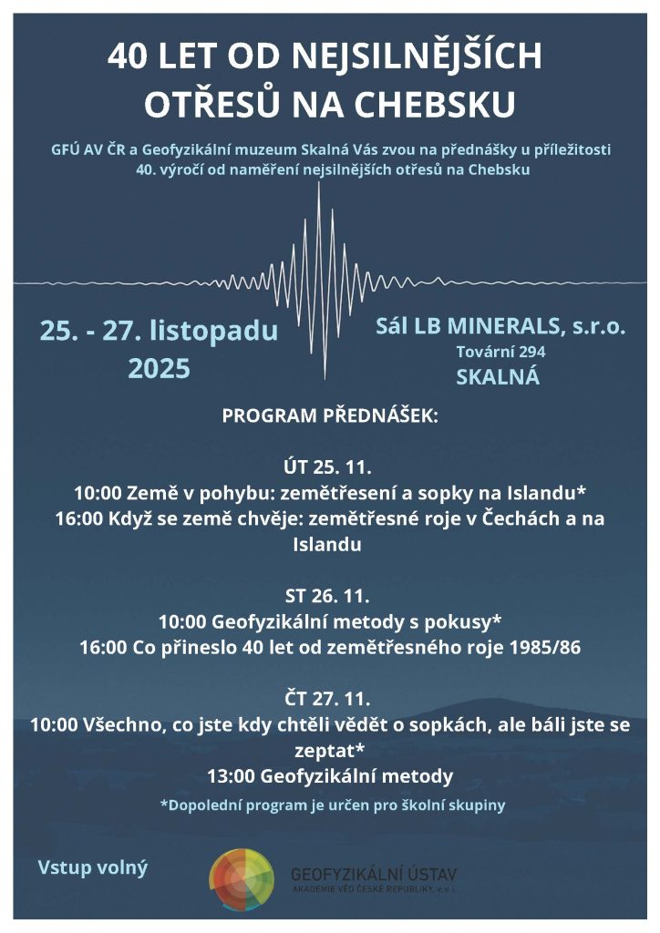 V posledním listopadovém týdnu uspořádal Geofyzikální ústav AV ČR společně s Geofyzikálním muzeem ve Skalné sérii odborných přednášek připomínajících 40 let od zaznamenání nejsilnějších otřesů na Chebsku. Akce přilákala více než tři stovky návštěvníků z řad žáků základních škol i široké veřejnosti.