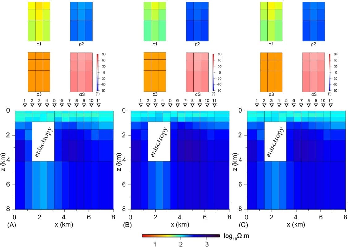 Ukázka z disertační práce: Řešení syntetického anizotropního modelu z algoritmu DREAM. Do izotropního modelu byl přidán anizotropní blok s třemi různými odpory podél os X-Y-Z a byl otočen o úhel αS. Mále trojúhelníky ukazují jednotlivé MT stanice. (A) min. a (B) max hodnoty 90% kredibilního intervalu, (C) průměrný model. Anizotropní blok je velmi dobře rozlišen, rozdíly mezi min. a max. hodnotami v rámci 90% kredibilního intervalu jsou zanedbatelné, tudíž získané řešení je stabilní.