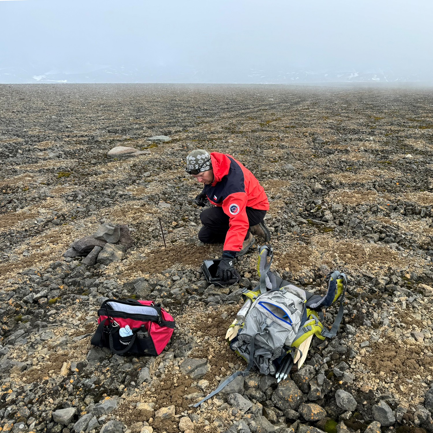 Downloading data from a temperature logger in sorted patterned ground on James Ross Island, Antarctica (photo – L Kaplan Pastíriková, 2024)