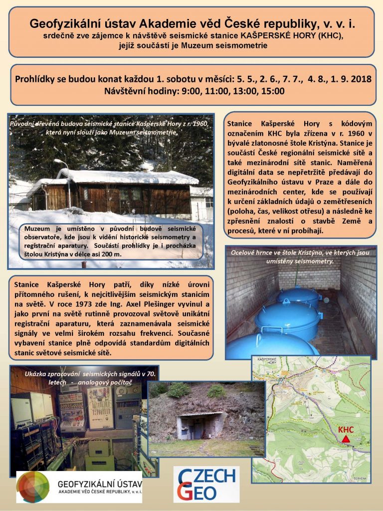 Muzeum seismometrie v Kašperských Horách se v sobotu 1. září 2018 otevře pro zájemce letos naposledy. Prohlídky se konají v 9:00, 11:00, 13:00 a 15:00 hodin. Naši kolegové vás provedou muzeem, ukáží vám historické seismometry a registrační aparatury a zavedou vás do 200 metrů dlouhé štoly Kristýna. Nenechte si tuto příležitost ujít a přijďte na exkurzi.