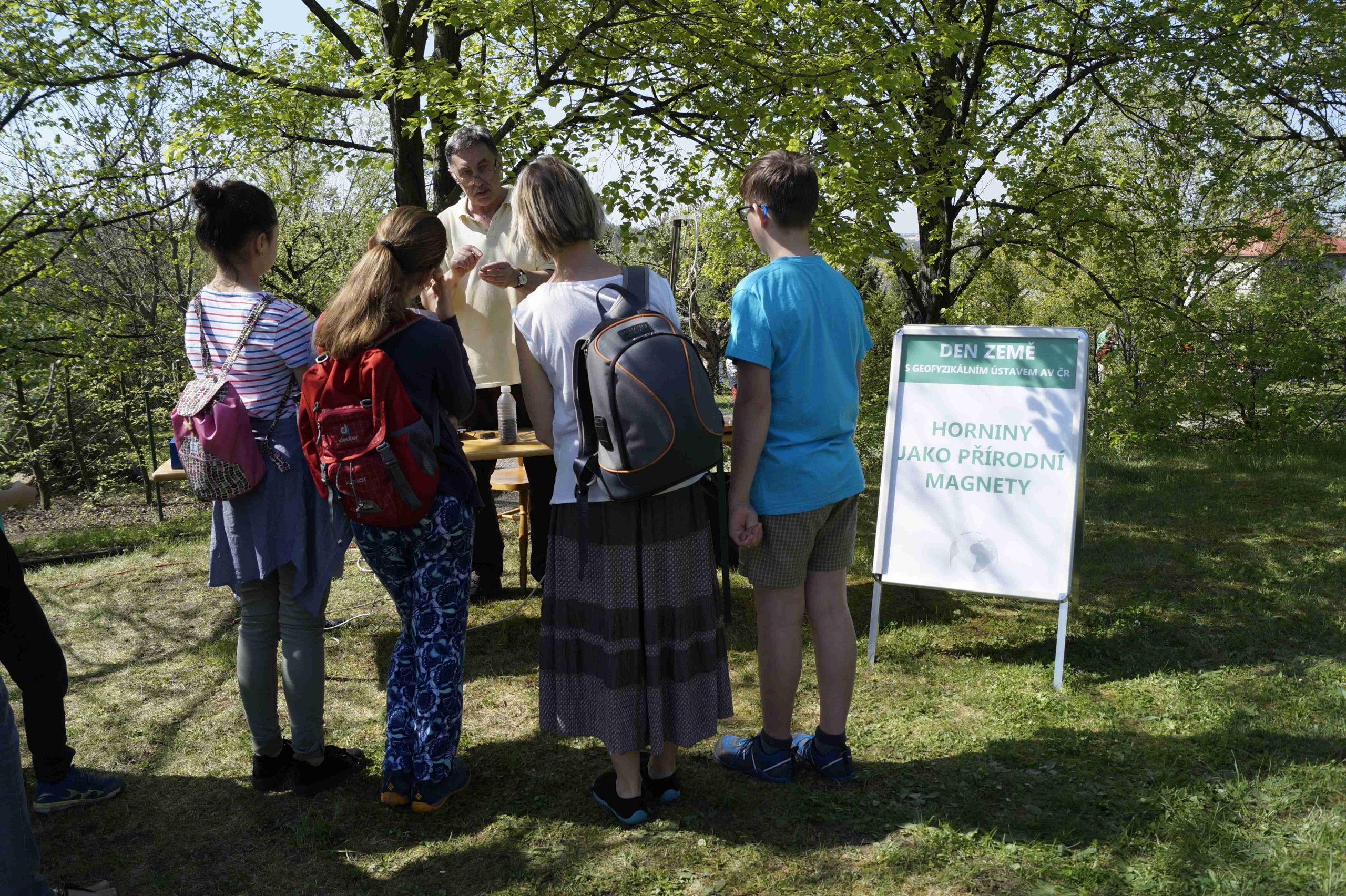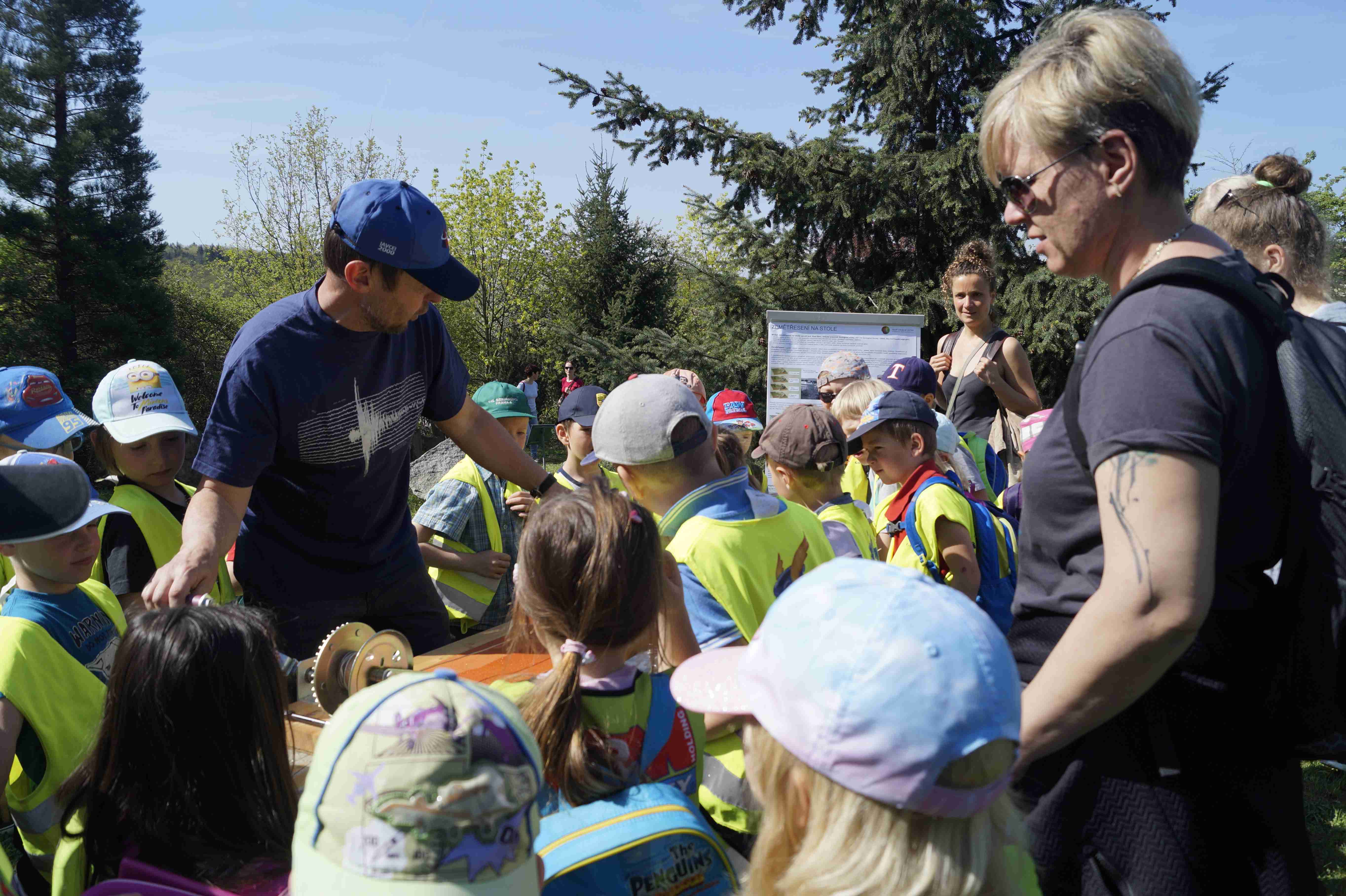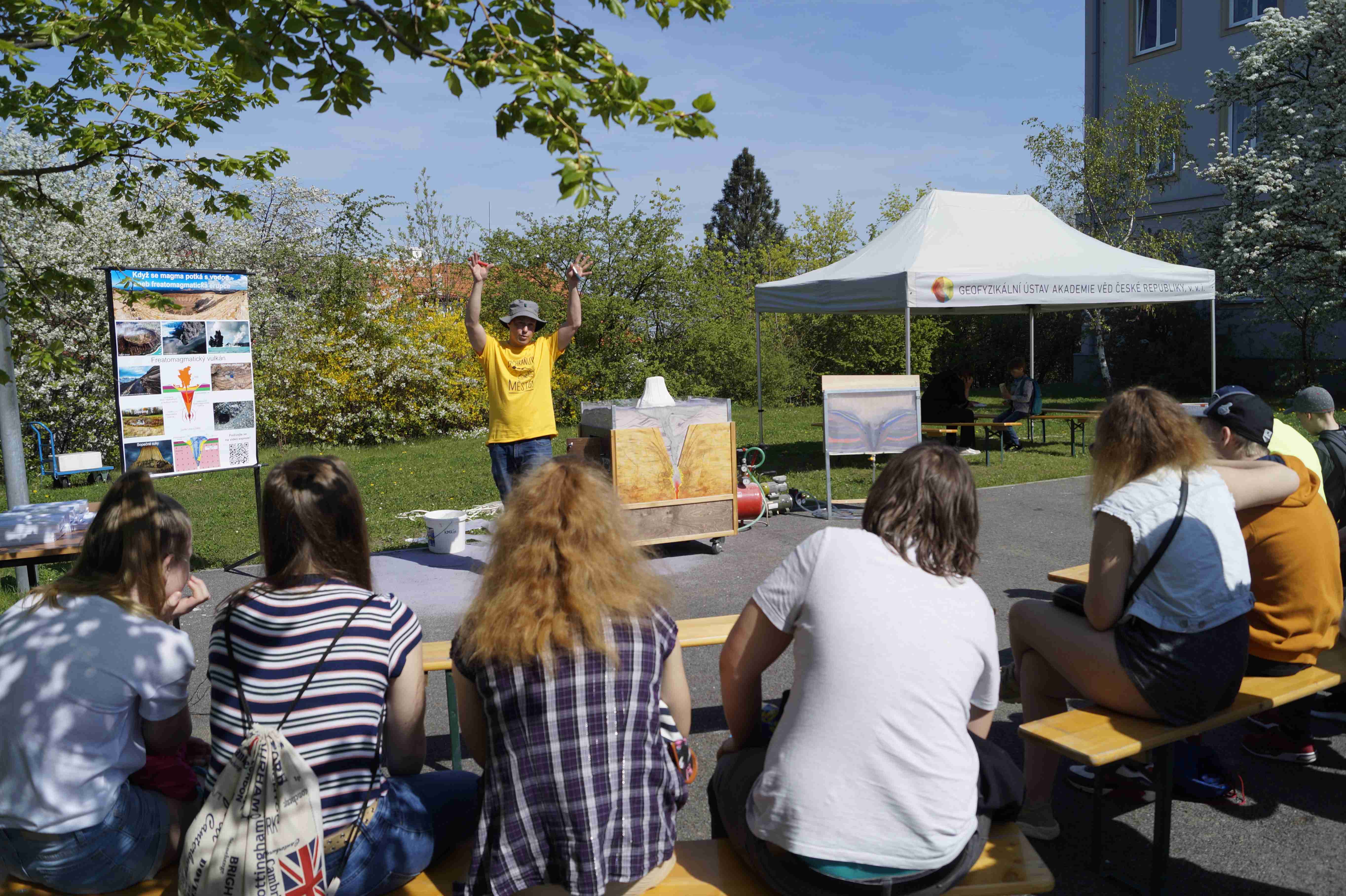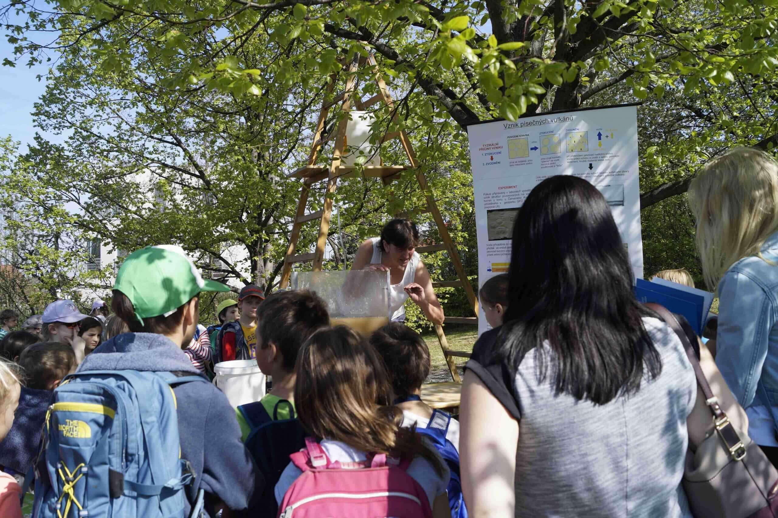 Přibližně 600 dětí z pražských i mimopražských škol využilo slunečného počasí, navštívilo náš areál a procházelo mezi stanovišti rozprostřenými před budovou Geofyzikálního ústavu AV ČR, uvnitř budovy i v geoparku Spořilov. Děti si mohly na vlastní kůži vyzkoušet citlivost seismických přístrojů, to když poskakovaly okolo seismometru a sledovaly křivky zaznamenaných otřesů. Seismologové z Geofyzikálního ústavu jim také pouštěli dunivé zvuky, které slýchávají svědci zemětřesení v západních Čechách. Na modelu pohybu litosférických desek mohli návštěvníci sledovat, jak padají domečky z kostek, když se najednou uvolní napětí, litosférické desky se posunou a dojde tak k zemětřesení.