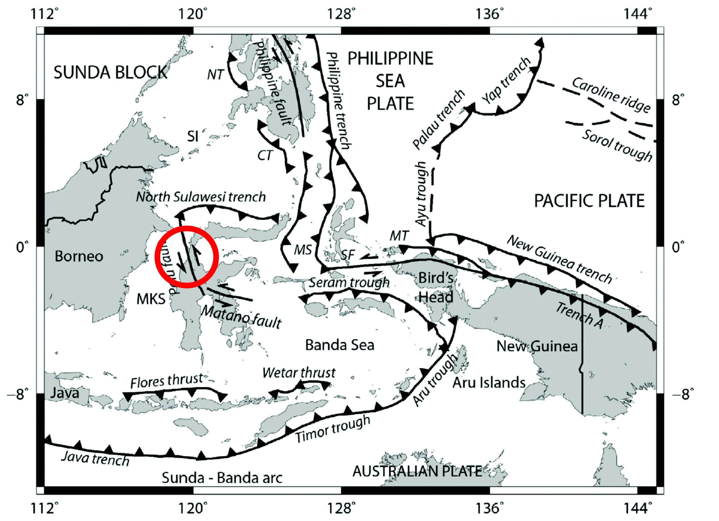 Východní Indonésie patří z hlediska geologické stavby mezi vůbec nejkomplikovanější oblasti na Zemi (obr. 4, 5). Silná zemětřesení zde vznikají jednak na subdukčních zónách (černé linie s trojúhelníky, které označují směr podsouvání oceánské kůry, tzv. subdukce) a jednak na svislých zlomech – jedním z nich je i zlom Palu-Koro, aktivovaný pátečním zemětřesením.