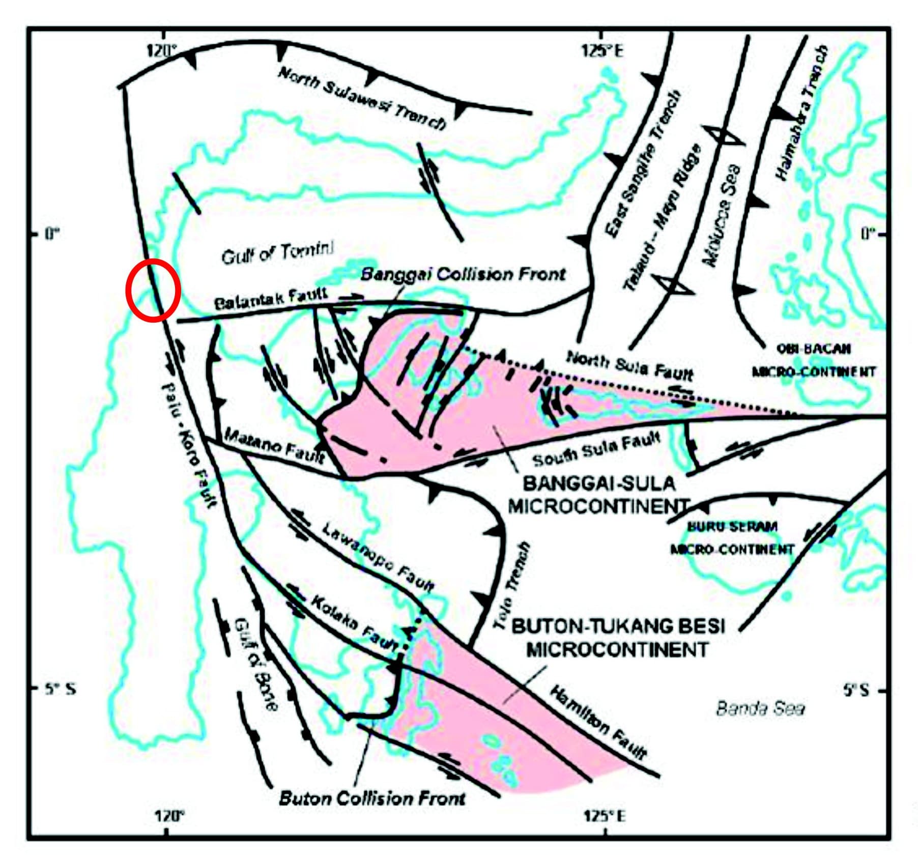 Tento zlom je součástí výrazného a dobře zmapovaného svislého zlomového systému Palu–Koro, který se na povrchu ostrova Sulawesi zřetelně morfologicky projevuje (viz obr. 2). Podél zlomu Palu-Koro se sousední bloky zemské kůry posouvají horizontálně rychlostí 3 – 4 cm za rok, a to tak, že blok východně od zlomu se posouvá k severu a blok ležící západně od zlomu se posouvá k jihu (obr. 3). Takovýto smysl pohybu se v tektonické terminologii označuje jako levostranný.