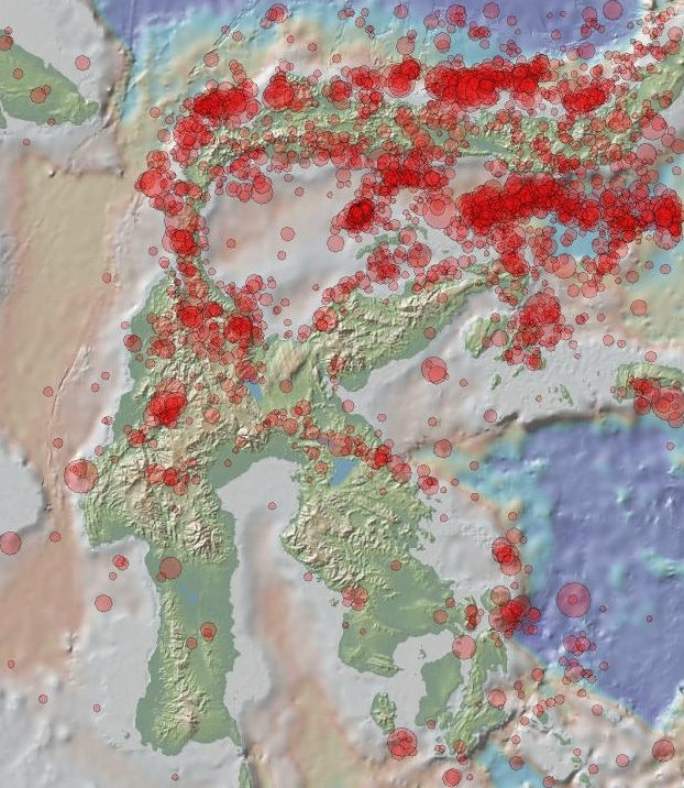 Severní výběžek Sulawesi je seismicky mimořádně aktivní, jak je patrné z epicentrální mapy na obrázku 1. Znázorněna jsou zde epicentra zemětřesení o síle 4,5 a silnější, k nimž došlo od roku 1976 do dnešního dne (celkem 2 569 zemětřesení).